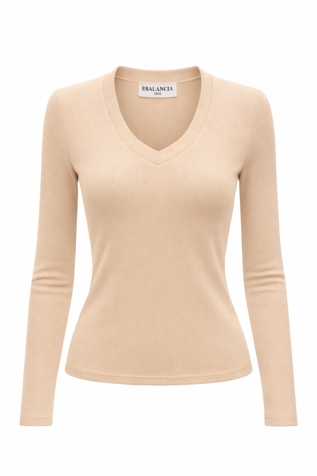 Sand Beige – Klasyka gładkiej bawełny i kobiecy dekolt V-neck