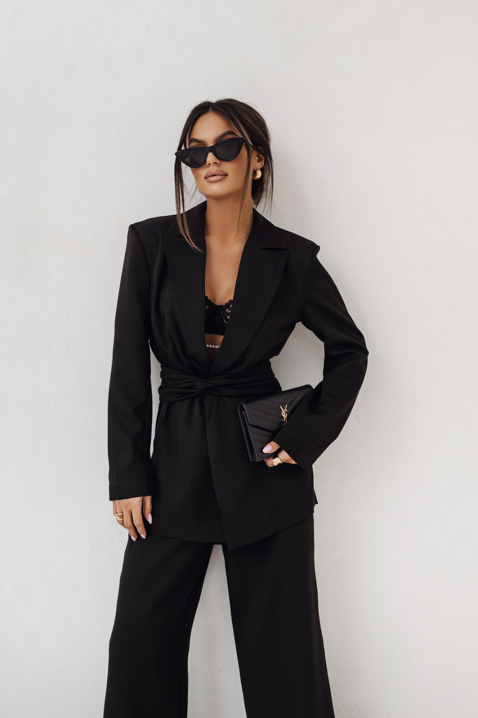 Architektura Sylwetki: Przedłużona marynarka o zdefiniowanej linii ramion i spodnie z wysokim stanem budują proporcje, które dodają pewności siebie przy każdym kroku.