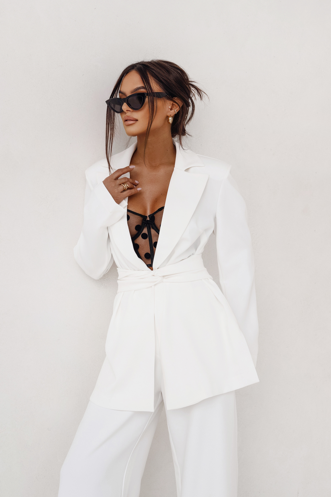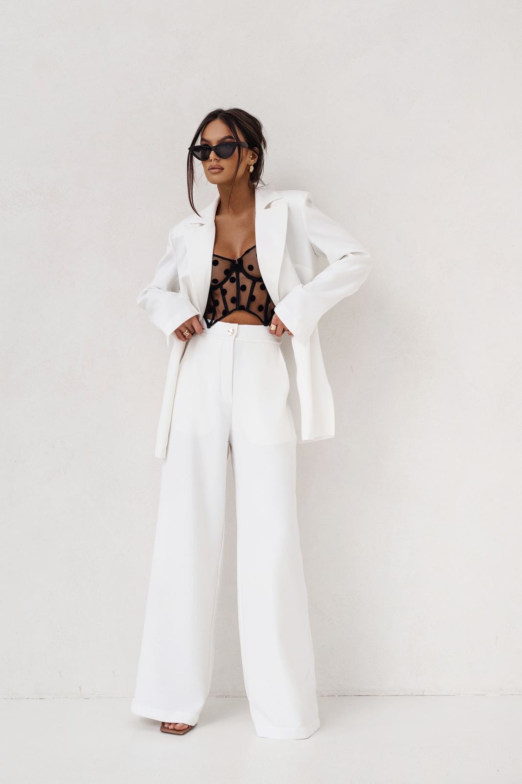 Perfekcyjna Architektura: Przedłużona marynarka o dopracowanej linii ramion i spodnie z wysokim stanem budują sylwetkę pełną gracji i kobiecości.