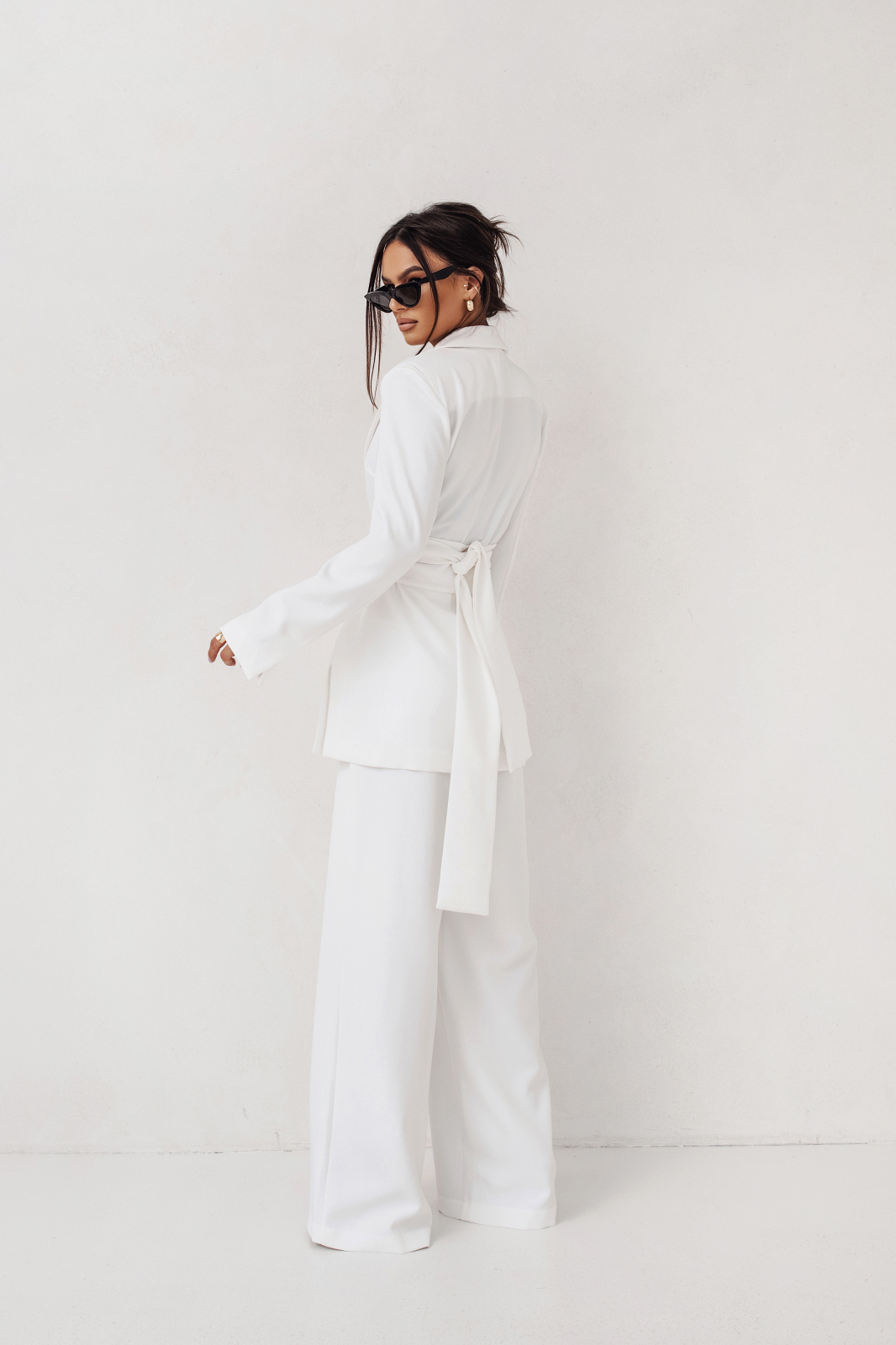 Wskazówka od Aniela Maison: Jasne kolory wymagają odpowiedniej troski. Aby Twój garnitur zawsze zachwycał czystością odcienia, pierz go w programie dla tkanin delikatnych i unikaj łączenia z ciemnymi rzeczami. Prasuj najlepiej parą, by zachować szlachetną strukturę wiskozy bez ryzyka przypaleń.