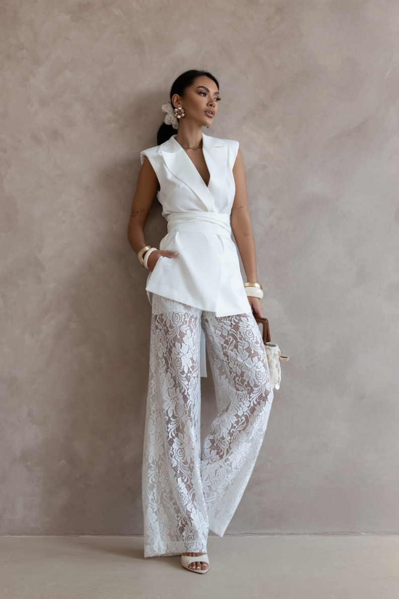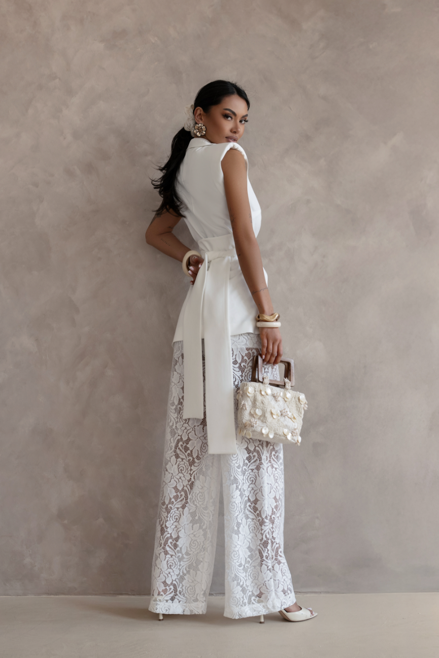 Komplet AURA Ivory Ecru to mistrz stylizacji typu „Total Look”. Aby uzyskać efekt „Old Money Aesthetic”, zestaw go z satynowym topem w podobnym odcieniu i złotą, masywną biżuterią. Na co dzień połącz kamizelkę z jeansami i mokasynami, a spodnie wykorzystaj w duecie z jedną z naszych tiulowych bluzek CLOE, tworząc zestaw pełen modowego wyrafinowania.