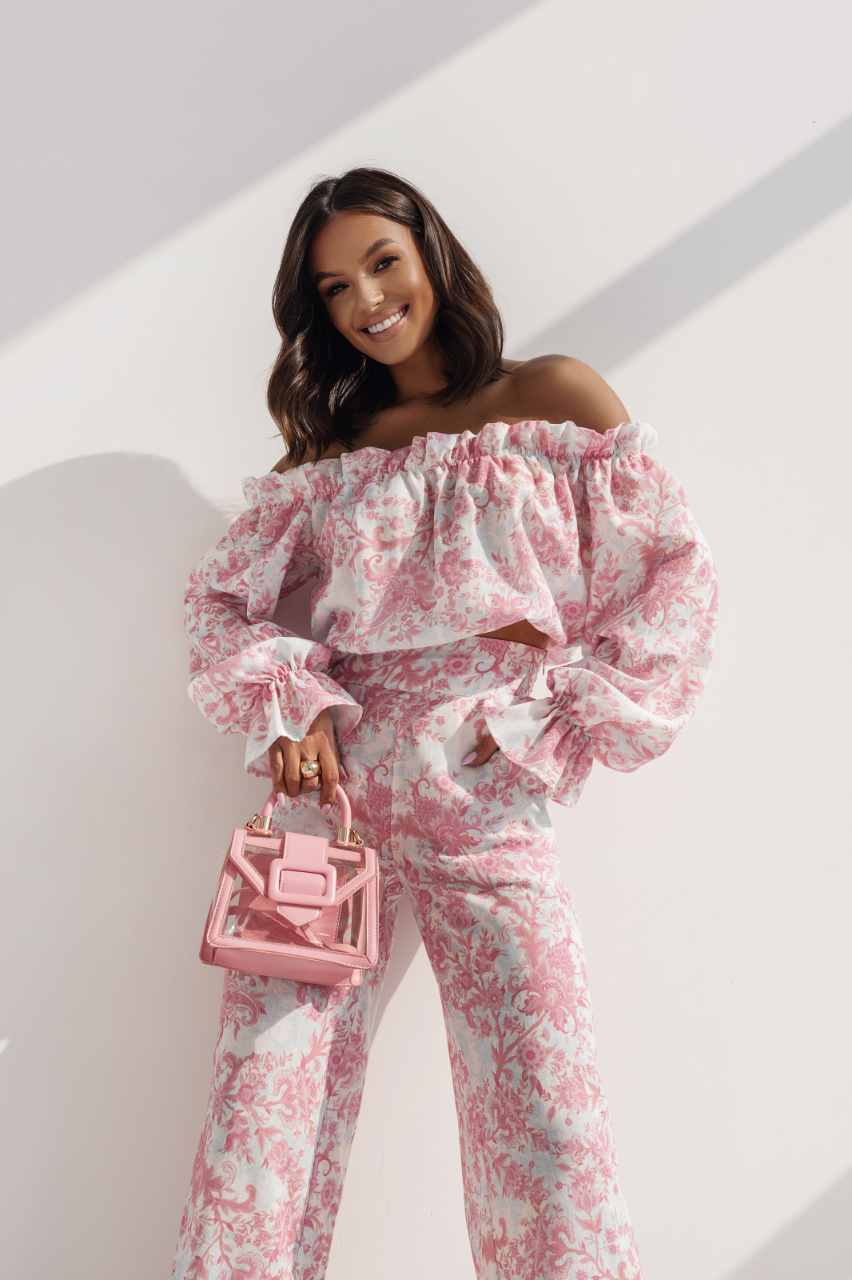 Komplet VIDA Powder Bloom to stylizacja, która zachwyca swoją spójnością. Aby uzyskać efekt „Silent Luxury”, zestaw go z jasnymi sandałkami i delikatną, różową torebką do ręki – to look idealny na letnie garden party lub lunch. Każdy element kompletu świetnie radzi sobie solo: bluzka typu carmen doda szyku Twoim ulubionym białym spodniom, a lniane spodnie palazzo stworzą doskonały duet z dopasowanym topem. Ten model rewelacyjnie komponuje się ze złotą biżuterią i delikatnym makijażem typu „glow”.