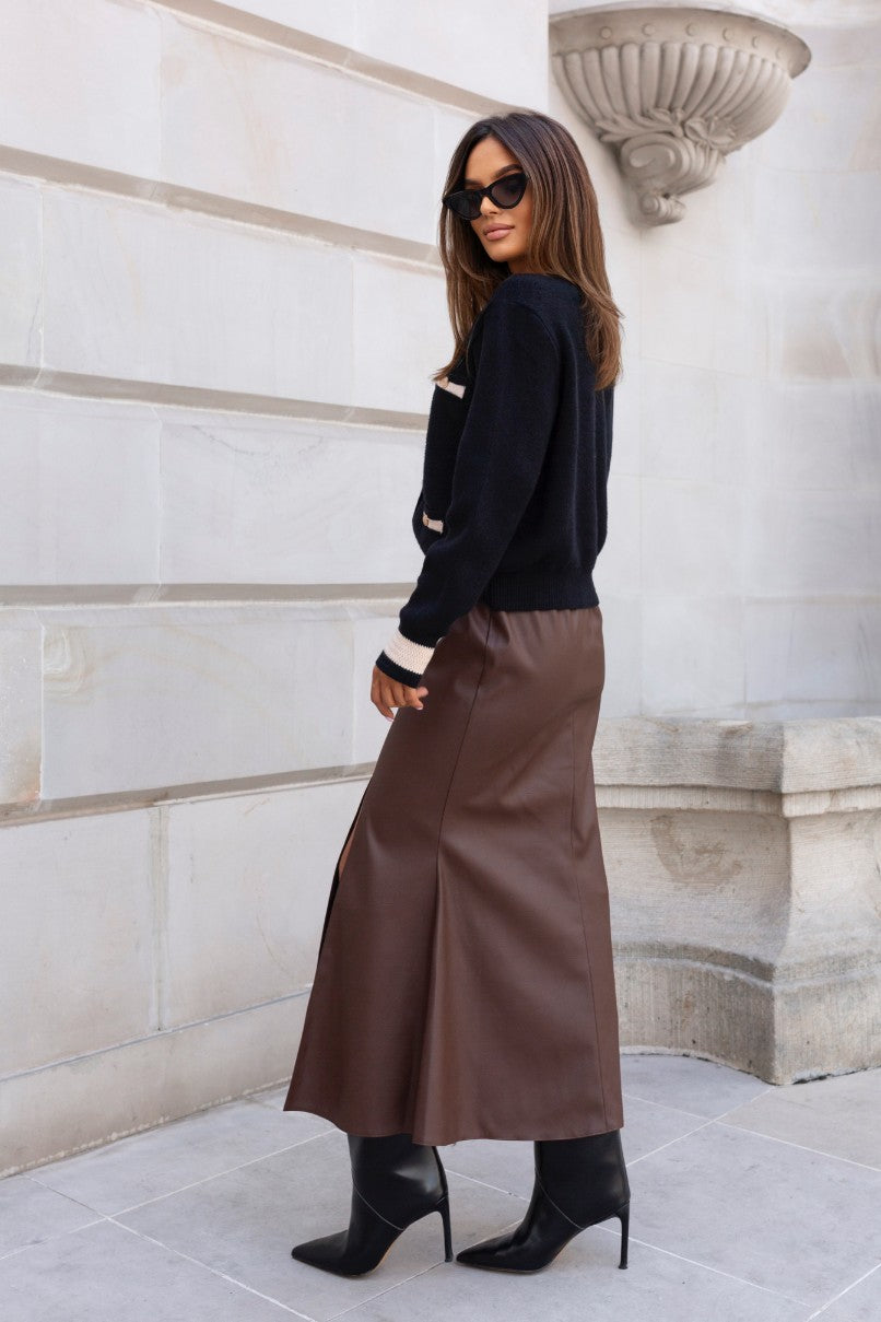 Stylizacja od Aniela Maison: Postaw na „Total Chocolate Look” łącząc spódnicę z dopasowanym golfem, lub przełam jej surowy charakter miękkim, kremowym swetrem typu oversize (tak jak na Twoim zdjęciu z kardiganem). To idealny zestaw na spotkanie biznesowe, randkę czy jesienny spacer w wielkim stylu!