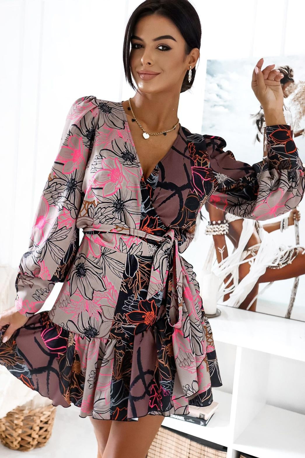 Sukienka "ANNA" krótka – Wzór tłobeż i brąz